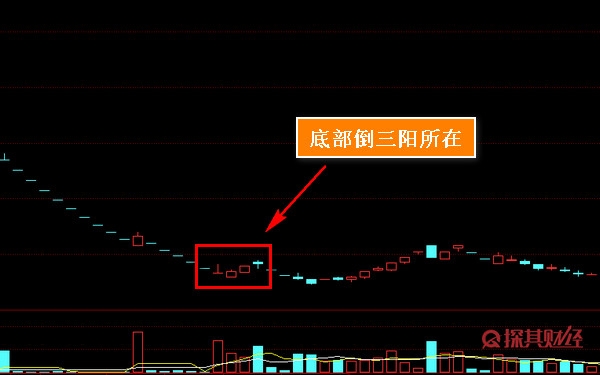 倒三阳此时的出现就是暗示该股目前已经在逐步止跌了,场外资金开始小批量进场做多。这种K线的形成一方面是因为投资者长时间杀跌卖出后已经极度恐慌,所以收阳会让其有所期待,但是第二天有人卖出该股就又会出现践踏式出逃,另一方面是长期下跌的个股不出现止跌的迹象,场外资金也会极为犹豫,因而他们的分批进场可以造成该股连续今日收阳但收盘价持续降低。