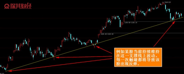 如上图,这是贵州茅台的日线。从图中我们能极为明显地看出该股长期处于支撑位所画出来的线上,且每次回踩都会反弹。对此,构筑支撑位线的点我们一般可以通过下述途径发现: