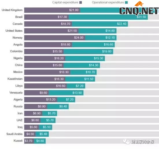 2016年初WTI原油的价格跌至30美元/桶以下的时候,有机构调查统计了全球20个主要产油国的原油生产成本(见下面的图片和表格,分为资本开支+运营支出两个部分)。